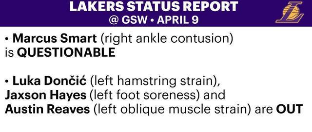 赛前湖人更新了球队的伤病报告,詹姆斯已经从伤病名单中被移除,这意味着他能够出战与勇士的比赛,右脚踝挫伤的斯马特状态更新为出战成疑,而东契奇(左腿筋拉伤)、海耶斯(左脚酸痛)以及里夫斯(左侧腹斜肌拉伤)则依然处于缺阵状态。
